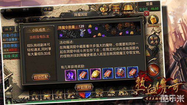 “降魔洞窟”副本每天可以进五次,类似于教主大厅副本,可以单挑全部通关领取最终大奖却是难度很大,建议还是五人组队推图比较轻松。二战二法一道的经典搭配,战士法师有群攻技能快速刷怪,道士施毒提高打精英怪和最后boss的效率,战士强力输出物理攻击,相辅相成。副本产出晶魄、新增的各职业秘籍以及黄金矿石都是很不错的东西啊。话说之前议论纷纷甚至被误认为bug的雷电术秘籍缘来由此,迅速get√,为没有灭天火的法师作以阶段性过渡。副本地图门票为每次20降魔令,降魔令可以在杂货铺里买,五千金币一个,价格还是比较合理的,咱可以一次性多买点,省的组好队了一队人等你再去买降魔令,那也是蛮尴尬的。副本限时三十分钟,地图随机、层数随机、未知的世界精彩无限。