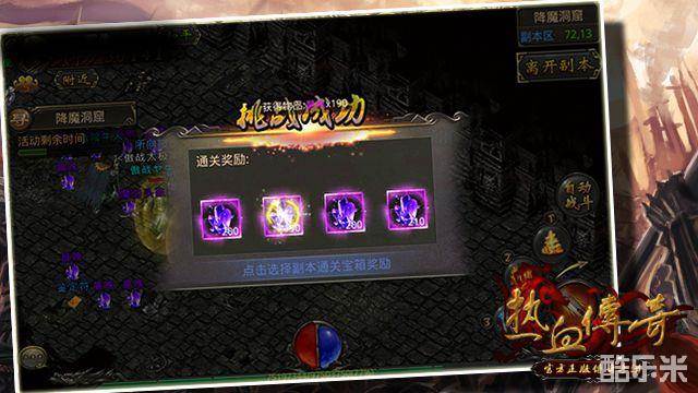 以副本共三层为例,第一层打完后过几秒全体队伍人员会自动传送到下一层,第二层跟第一层是一样的,打到第三层最后会出一只终极boss“洞窟恶魔”,击杀后会爆出大量的晶魄和少量紫装,并有几率爆出黄金矿石和三大职业新增的技能秘籍(战士的半月弯刀秘籍,法师的雷电术秘籍,道士的强化骷髅秘籍)。当然了,副本嘛除了boss爆的东西外当然还有系统奖励啦,同样是四个宝箱抽取模式,基本都是二百左右的晶魄,小编打的几次抽到的都是二百左右晶魄,相当的给力啊有木有!第一次通过降魔洞窟副本系统还会送三瓶绑定祝福油哦!亲们千万不要忘记领取。