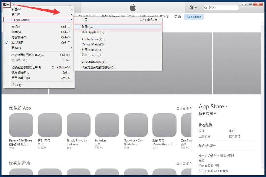 第二步:在itunes【登录】苹果帐号