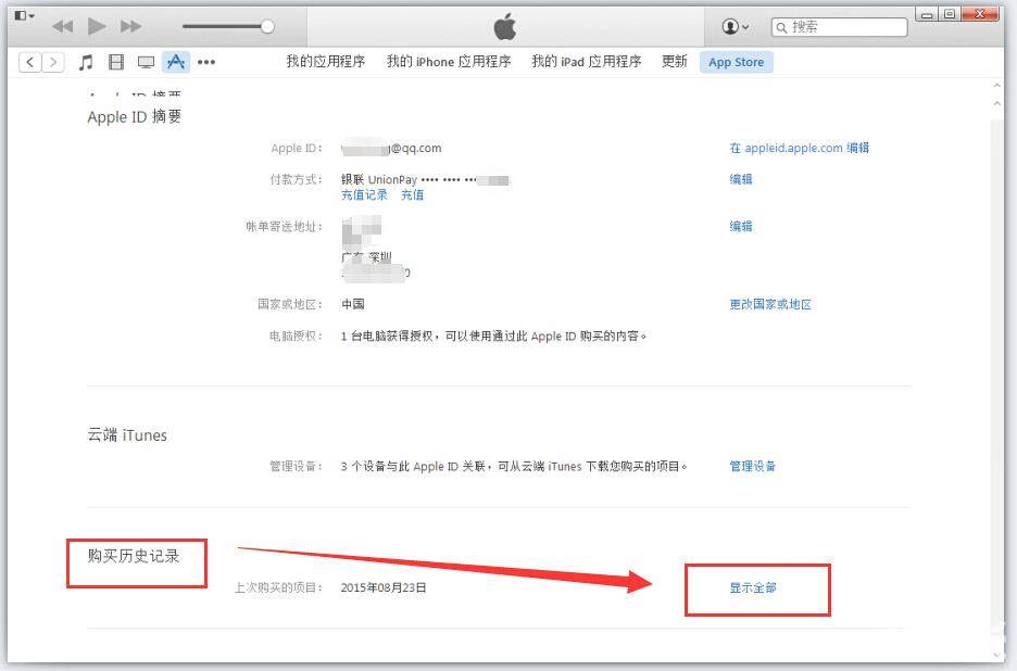 第四步:在【账户信息】点击购买历史记录的【显示全部】