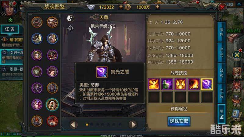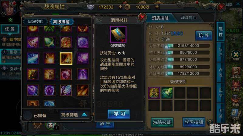 强效魂灵、强效魂甲、强效魂元:这3本技能书都是以牺牲一部分攻击属性为代价来增加防御能力,强效魂灵是降低15%的命中率和闪避率,增加25%生命值上限,强效魂甲和强效魂元都是降低10%的物攻和法攻,增加30%的物防和法防。由于天尊的力量和智力天赋并不高,所以降低的物攻和法攻并不多,而得到的生命值、物防和法防收益很大,这些属性对战魂血契的转化也非常重要,能够转化给主人更多的双防和生命值属性。
