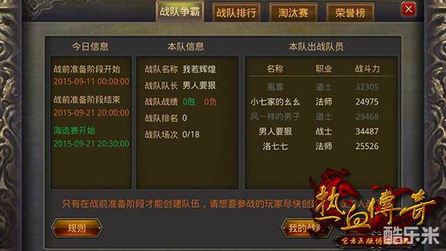 今日信息处显示战前准备阶段的时间段及海选赛开始的时间,本队信息显示本战队的基本信息。本队队员显示本战队成员的在线情况,离线成员显示灰色。