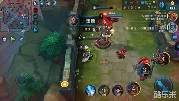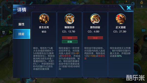 程咬金能担任队伍的前排全仰仗于三技能,高额的生命回复效果让他拥有超高的生存能力,而移速的加成保证了他可以轻松脱离敌人的追击。玩家利用此技能可以做到以下两件事:1、在团战中可以吸收第一波伤害,然后开启三技能迅速脱离战场并回复自身生命,等待血量健康后再次入场;2、让程咬金拥有了带线分推的可能,只要他拥有三技能,他就可以去边路带线推塔。