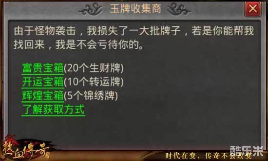 富贵宝箱需要20个生财牌,大家只要在相应地区挂机刷怪,就能够集齐全部玉牌兑换奖励;开运宝箱的兑换难度也不高,大家注意参与各大活动,也能快速的收集全部玉牌兑换奖励;辉煌宝箱的兑换难度偏高,掉落概率极低(世界BOSS掉落的概率更高),只有一部分运气较好的人才能得到锦绣牌。