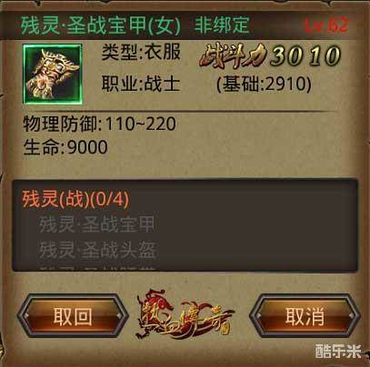 概述:残灵装备也可以用以和圣战装备比对,和其他残系装备一样,残灵装备也是有等级限制的。残魂装备装备的基础战斗力要比圣战装备高,但装备属性要差一点。装备4件残灵装备可以获得非常不错的属性加成。