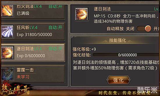 7、技能:在学习新的技能后,经常使用技能可以增加对应技能的经验值,经验值累计达一定数值,即可升级。在技能满级,且拥有技能秘籍后,可开启技能强化,消耗技能点进行技能强化可以提升角色的战斗力。
