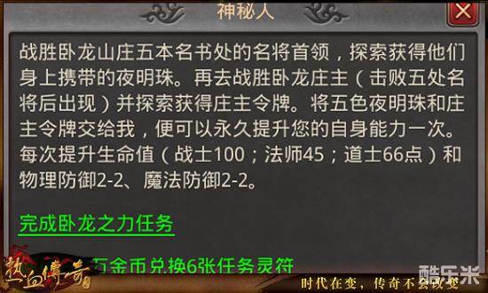 此外,12月版本更新后,开放的卧龙山庄里的卧龙之力任务也是快速提升战斗力的一个重要途径。战胜卧龙山庄内的五本古书名将和卧龙庄主,使用任务灵符探索遗骸,可获得五色夜明珠和庄主令牌。收集五色夜明珠和庄主令牌可在神秘人处提交任务,并根据职业的不同获得生命值、物理防御和法术防御属性的提升,战斗力也会随之增加。完成卧龙之力任务提示的属性值是永久的,所以这个任务是一定要做的!