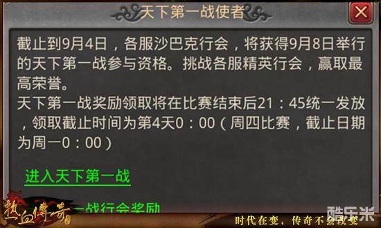 截至至9月4日(开服一个月以上的服务器),各服的沙巴克行会,将得到9月8日举行的天下第一战的参与资格。挑战各服精英行会,赢取最高荣誉。