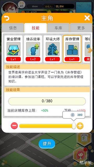 当你遇到升级或发展瓶颈时,可有针对性地升级对眼下发展有利的对应技能项,例如,遇到由于店铺客流上限过低而导致预收入无法拉高时,可以尽可能地让主角学习企业管理技能,提高了客流上限自然预收入也就上去了。
