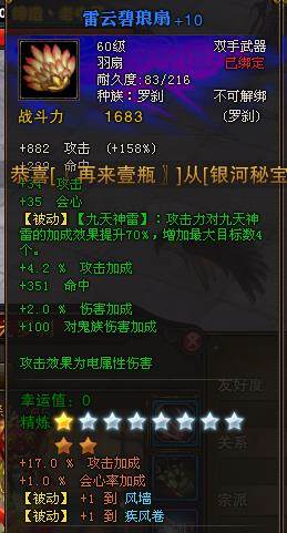 第四、冲星,把精炼好的祭品星继承到幸运到600的主武器上,精炼满后备份,如果出了银一样要备份,就算出了2个银幸运还是有400的。如果出了金吃掉了所以幸运怎么办?这个时候看金的品质,如果很好值得留可以留着,如果不好有两种选择,要么留着这把武器做加10的时候主祭品,毕竟有两颗金成功几率高,还有就算还原到600幸运,浪费继承过来的那颗自认为不错的金。看个人选择吧
