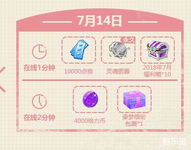 玩家在7月14日不仅能获得经典服饰,累计在线一分钟还能获得点券*10000,灵魂银器*永久以及2018年7月福利箱*10,在线2分钟还有给力币*4000,圆梦缤纷包裹*1