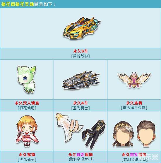 随着新版本登场,全新活动摘星阁将和大家见面,一系列豪华奖励轻松获得,永久S车【黄蜂战神】、永久双人骑宠【梅花仙鹿】、永久A车【圣光骑士】 等豪华奖励等你来拿,千万不要错过!