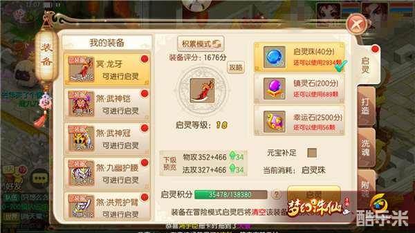 打造装备最重要的是启灵和洗魂可以极大的提高装备的各项属性,首先我们来看一下启灵,启灵给装备可以带来极大的属性加成,但是启灵属于越到后期收益就越少,但是对于武器这件装备来说,最好将它启灵到满级。虽然对资金的消耗非常大,但是得到的收益是其它装备无法相比的。我们在启灵的时候一定要注意顺序哦!先启灵武器,鞋子然后在启灵其它的装备。