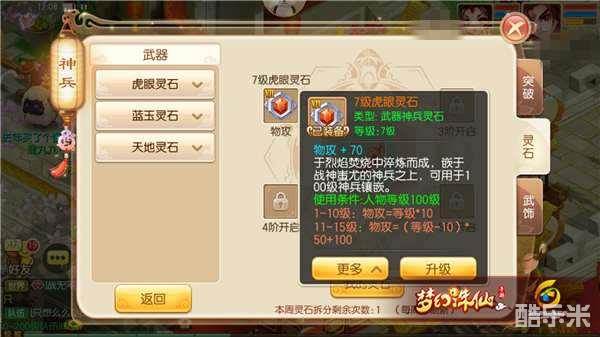 装备的突破同样可以增加装备的属性,虽然增加的不多,但是当装备突破到二阶之后,我们是可以镶嵌灵石。灵石对于装备的属性提升是非常明显的。我们可以镶嵌虎眼灵石,蓝玉灵石,天地灵石。这三种灵石分别可以增加物攻,法攻,封印这三种属性。我们可以根据打造的装备来进行镶嵌灵石。对于龙牙这件装备来说,建议小伙伴镶嵌虎眼灵石,这样可以将龙牙的优势充分发挥出来哦!