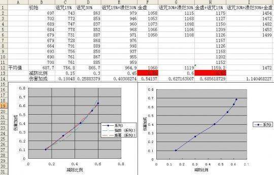 这是我在靶场打55级首领靶测试的,本来是想用函数算出金虚和诅咒溃烂哪个先减的问题。但是可能因为数据量偏少,拟合的函数不太精确,包括函数形式都影响了最后结果。所以没有结论,但用指数形函数拟合结果偏向是先减固定的金虚再减百分比,红框里是拟合函数计算出来的减防百分比。这个结果大家看看就好了,楼主是个大学生只会用excel了 matlab早已还给老师,有没有数学大神帮我算算