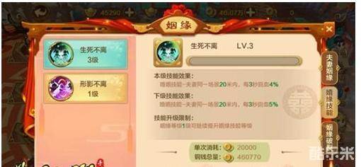 玩家还将获得夫妻技能形影不离与生死不离。消耗铜钱可提升姻缘技能等级,但技能等级会受到姻缘等级的限制。形影不离效果为可瞬间传送到伴侣身边。生死不离效果为使用后可以复活伴侣。