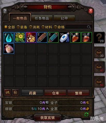 鼠标左键点击游戏主界面右下方系统菜单区域的背包图标,或者按键盘B键,可以打开角色背包,查看可使用的道具物品。点选装备、消耗、材料、药品等页签,相应类别道具将会以高亮方式显示。