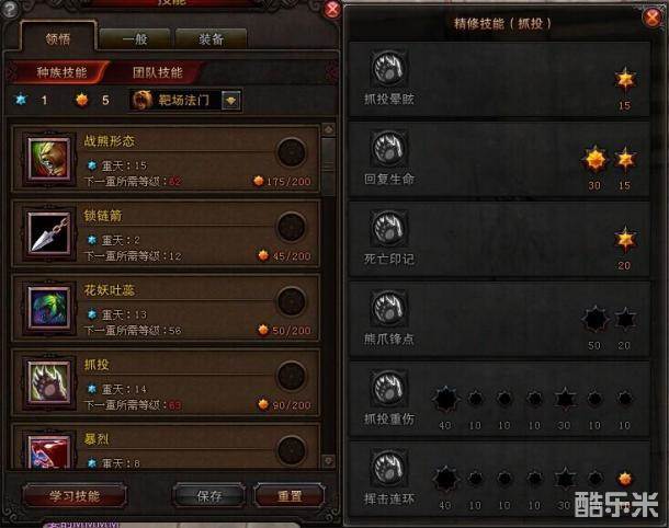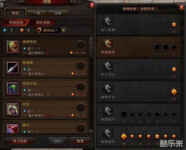 战熊姿态的开启攻势,我分别点了一点、二点、三点,感觉去输出的时候都很不爽,老是移位,全部开启后地面出现火焰,我以为和类似移动系的射天砸下来的火焰那样伤害可观,可是经过反复测试,真的没什么用处,看了别人的参考说开始点2点就好,可是,点了之后也很鸡肋,效果不明显,操作不顺手,果断放弃了,现在这样点个人感觉很不错。