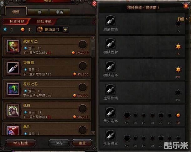 在说下锁链吧,这个技能能吃队友的伤害,相比大家都知道,小怪多的时候,什么技能不丢,丢个锁链箭,秒伤都会呼呼涨,如果在丢了锁链箭后来几个技能,那伤害是很可观的,可是朋友告诉我,猛扑清小怪已经够用了,没必要在点这个,我就洗点重新试了下,感觉没有锁链箭真的很不爽,虽说清小怪可能够用,但是我个人感觉加上锁链箭效果更好。