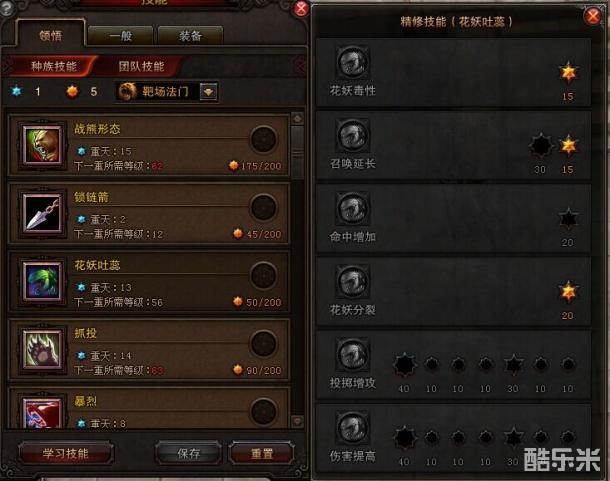 花妖,这个技能我本身是把伤害提高点满的,可是我又想把暴烈的冷却缩短点满,因为那个时间太久我很不舒服,所以把这里取舍了,就靠他上溃烂算了,反正靠它去伤害效果也不是很明显,因为我的领悟点不够了,所以召唤延长我就点不满了,反正我也没有那个传奇美菩萨,,要是有美菩萨的亲,可以舍弃暴烈的减CD,把伤害提高点满。还有召唤延长。看亲们自己取舍吧