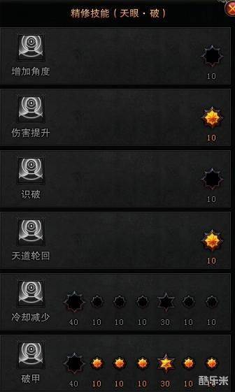 天眼破,元素必不可少的技能,点上伤害提升成效+40%,天道轮回恢复体力,破甲35%几率降低防御20%如果脸不是太黑,天眼四下总会中一下,什么?你说这个技能攻击不高?根据剧本设定我们元素是辅助职业,那么你想想,一个能减防的神将是多么的可爱啊。。。