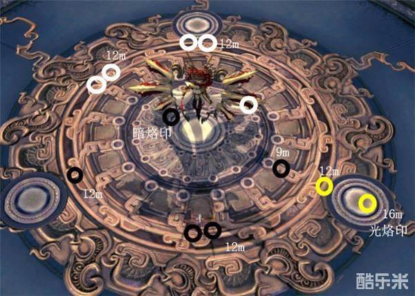 接下来泰天冥王会向指向光烙印者进行传电,上图中16米的光烙印被BOSS指后,电会传到12米光炎携带者身上,接着又传到9米的暗炎携带者身上,如果少于3人传导烙印者直接死亡灭团。传导完毕后,会以烙印者为中心生成一个光柱或者暗柱。