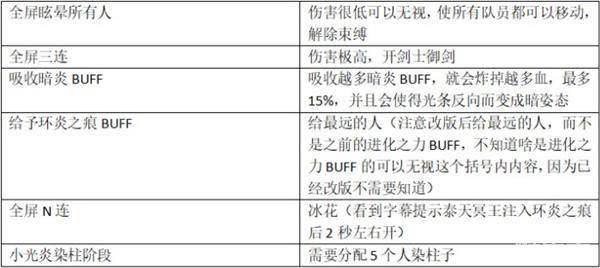 这里需要讲解为什么之前拉出1光5暗柱子。因为获得幻炎之痕BUFF的人触碰光柱后会得到大光炎,而大光炎一共有5层,当队友从他身边路过就会拿走一层小光炎,规定时间内如果不拿完,大光炎会死亡,字幕提示泰天冥王失去目标而狂暴。