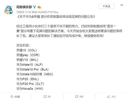 “负优化”传言出现之后,刺激战场方面迅速响应,于7月8号发布公告解释了此次花屏BUG的出现原因:“华为在近一周推出了一个GPU Turbo的新技术并升级了新ROM, 针对四款机型荣耀V10、荣耀Play、Mate10和P20的用户进行了小范围测试,出现了一些适配兼容性的技术问题”,并提示当日华为方面已经推送了相关修复补丁,也正面驳斥了“负优化”的说法,强调“不会、也没有任何理由去做这种损害玩家利益的操作”的立场。