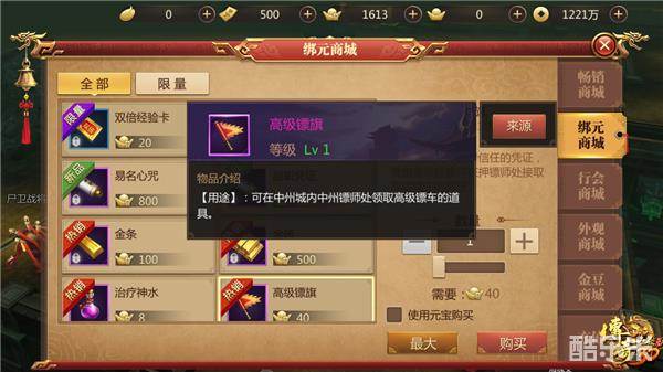 绑元商城中购买道具也是存在优先顺序的,第一优先的购买道具为双倍经验卡、高级镖旗以及神翼进阶凭证。首先双倍经验卡属于限购道具每天只能入手三个,为了更加长远的发展大伙最好有意识的堆积一些,这样就再也不用担心日常刷怪或者是进入宝地之时没有双倍经验卡可用了。