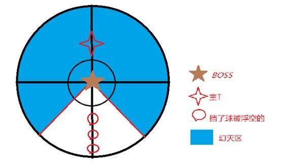 BOSS三次窜地后跳中,距离最近的人获得注视BUFF,推荐主T获得。BOSS开始安全区模式,安全区模式第一次扇形安全区为主T方向,需要注意此次扇形安全区扫描起始位置,从右方开始扫描,则安全区会逆时针90°移动,为了让安全区位置不变,主T需要顺时针90°移动。