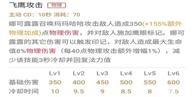 整体解析:娜可露露向攻击范围内敌人丢出一只鹰,可以远程对敌人造成伤害,而受到鹰攻击的敌人还会受到标记,娜可露露攻击此名被标记敌人可以缩短一技能CD,且对敌人造成更高的伤害。所以娜可露露在使用一技能时,优先标记敌人的输出英雄,并攻击被标记敌人,确保可以快速的击杀敌人。