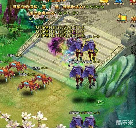 6.在每一波怪物中都会存在一部分飞行怪物,飞行怪物需要玩家在飞行状态(翅膀+10或者使用光之翼)下才能击杀,飞行怪物会从洛水城的东北方和西南方出现,直取城主灵威仰,注意击杀飞行怪,才能保护洛水城。如下图所示: