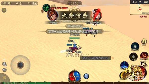 《传奇世界3D》手游中荒漠求生玩法相信大家并不陌生,但是荒漠求生和现在很多的吃鸡类游戏还是有较大的不同的,其中刷怪拾取装备就是一个亮点,其次拾取技能也是一个亮点。固定时间刷圈让玩家能够在前期收集到足够装备后,能够有足够的时间参与到战斗中。游戏中地图安全区刷新还是很快的,所以前期一定要多多注意安全区的刷新情况。