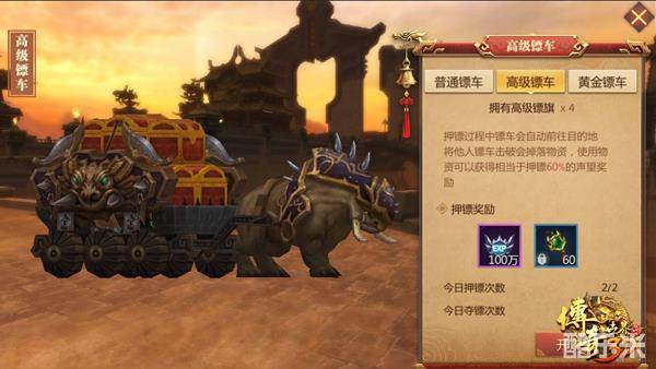 首先得明确一点,那就是押镖时必须选择高级镖旗:高级镖车与普通镖车的奖励有一倍之差(光经验差距就能达到百万),而在游戏初期升级经验需求较少的阶段,每日百万的经验差距就能影响到大伙的升级速度,因此要想在等级上不落后于人,“高级镖旗”一定要舍得用!