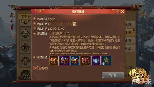 每日固定时间由行会开启,活动时间持续一个小时,期间行会玩家都可以进入魔城渐进性攻打。魔城分为多层副本,每层都有五波怪,最后一波怪还有一个BOSS怪,击杀当层小怪和BOSS后,就可以进入下一层进行挑战。在最后一层副本中,限时内击杀掉投石巨魔后,就可以获得挑战铁血魔王。而其他行会玩家则会根据排名获得不同的奖励。