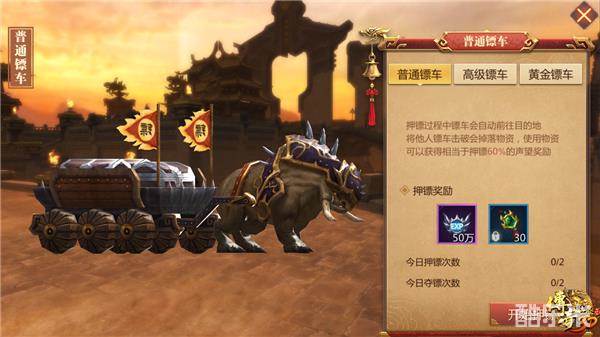 在日常押镖活动中大伙可以通过护送镖车来获取经验和声望令牌,不同的镖车押送之后获取的奖励都是不同的。在日常押镖中一共存在两种镖车,分别为普通镖车和高级镖车,其中押送普通镖车不需要消耗任何道具,但是中途被劫镖的几率非常高。因为普通镖车的生命是高级镖车的一半,在劫镖时可以省下不少的功夫。最重要的是普通镖车还会受到豪侠两大技能的威胁,如果触发的话豪侠每次攻击不仅会打出成倍的伤害,还有可能将镖车打停,这是非常可怕的,一旦镖车停滞不动,豪侠的输出频率就会增高,那么镖车被击毁的几率就会无限放大。