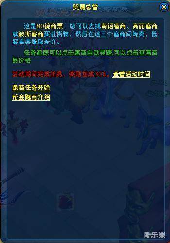 跑商这事,利帮利己,何乐而不为!30级以上的玩家可以通过贸易总管npc参加帮会跑商任务,每日19:00到21:00参加活动,可奖励加成30%。玩家点击跑商任务开始,就可以开始康庄大道第一步了。