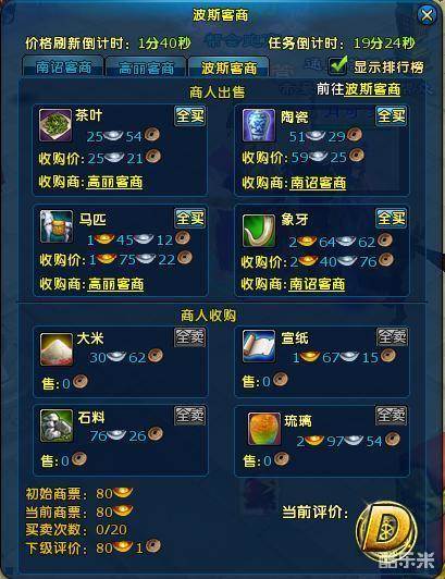 玩家有80锭商票可以进行使用,一共有三个客商可以进行商品买卖,他们分别是南诏客商、高丽客商、波斯客商。跑商限时20分钟,买卖次数20次。所以玩家要慎重选择商品,同时也得注意控制时间。