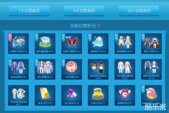 充值1QB=10炫贝=1个幻想音符,每使用1个幻想音符就可获得1幻想积分。玩家可使用幻想音符,抽取奖池中的各种游戏道具,来试试你能否“一发入魂”!