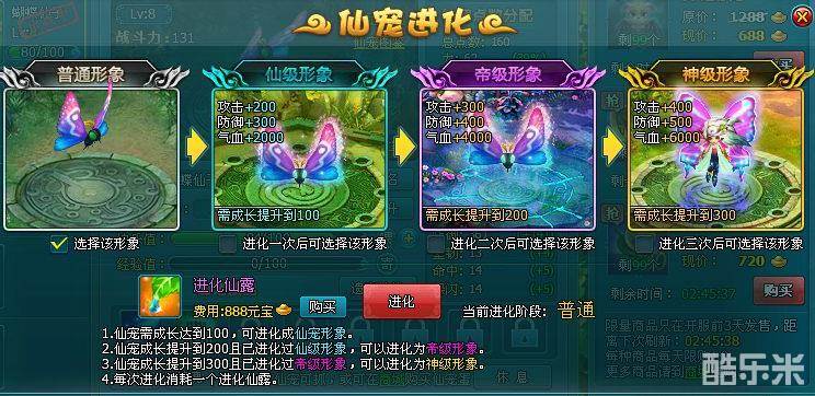 仙宠进化新增帝级形象,由之前的三级形象变为四级形象,每级进化所需成长条件由150 和300变为100、200和300。宠物变身门槛更低!