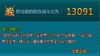 想了解你在全飞仙世界中的大致实力排名吗?现在每日第一次登陆,璃儿就会告诉您,您当前在全世界数千组飞仙服务器,数百万飞仙仙友中的战斗力排名,您可以清楚的知道自己击败了多少仙友,拥有更明确的目标。