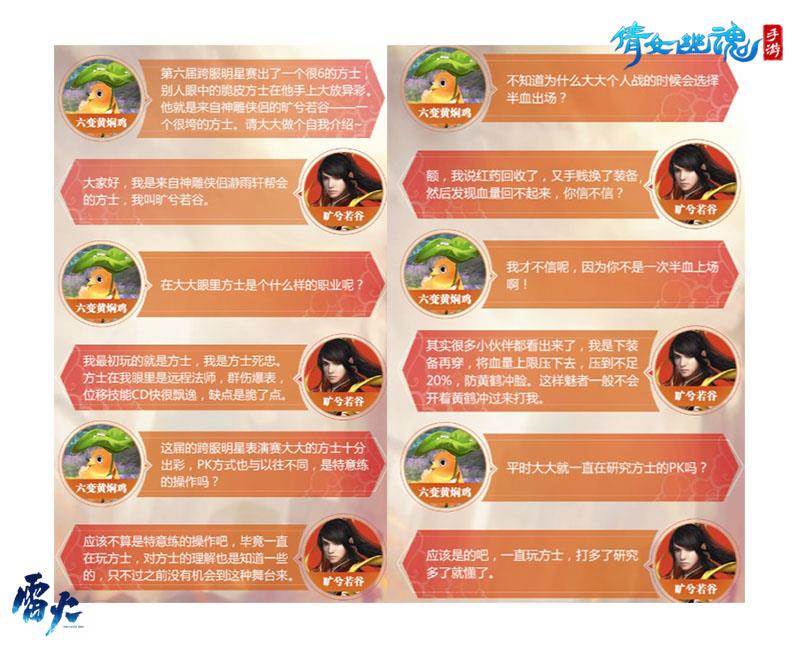 虽然【旷兮若谷】在本次明星表演赛中大放异彩,但他却笑称:自己的技术都是被队友虐出来的,平时在帮会中只能打过奶妈?看来这个孕育出大神的帮会也不简单,虽然平时大家都在语音里打打闹闹欢乐互怼,但队伍里每个人的实力都很强。【旷兮若谷】表示平时跟队友PK时他经常被队友打崩心态,而这次比武回来,队友们更是各种不服,虐了他一个通宵!小编觉得,也正是在与队友的大量的切磋中,【旷兮若谷】才积累了丰富的实战经验,同时自己的操作和技术也在不断地进步,为本次的胜利奠定了基础。