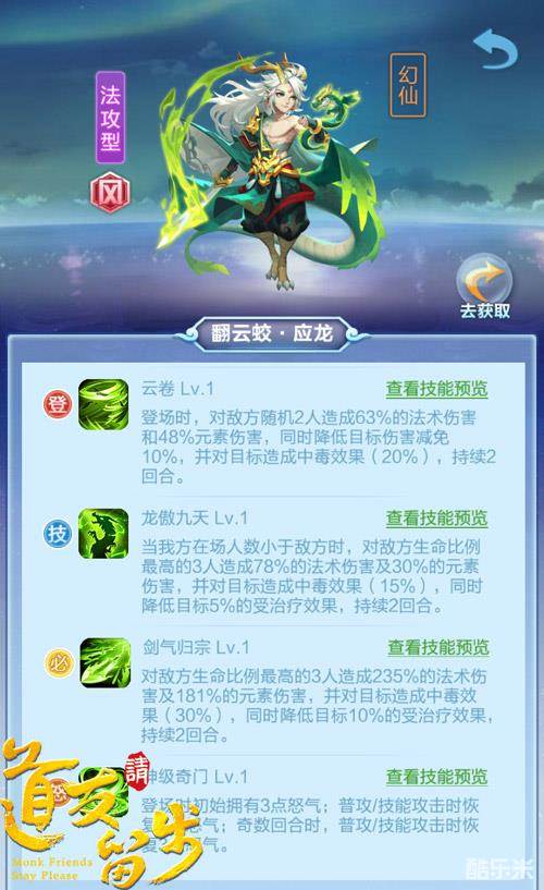 “乘风而行,身后留下的是不羁和洒脱;御剑而出,锋芒间,儿女情长化为过眼云烟”。本周为玩家带来豪华大礼包的幻仙是翻云蛟应龙。应龙是一名法攻型的角色,在实际战斗中拥有五个可以使用的技能。登场时即可为敌方带来减伤及中毒两个buff,可以起到很好的先手控制作用。应龙的必杀技“剑气归宗”则附带了减疗效果。减伤、减疗还附带中毒,应龙不愧为行走的DEBUFF。