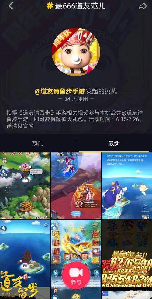 自6月29日道友节正式拉开帷幕已经过去了近半个月的时间,说好的“狂欢一整夏,福利一整月”少一天都不行。除了游戏内的海量福利不断放出,《道友请留步》在微信、抖音等平台上的活动也在持续进行中。上周《道友请留步》微信公众号公布了“贴吧签到王”、“热心指导员”、“最强道王奖”等获奖信息,接下来还将继续公布“最棒写手团”等奖励名单,敬请期待。同时,第三期抖音挑战活动“最666道友范儿”也已拉开帷幕,超有趣的小唐僧等你来看!