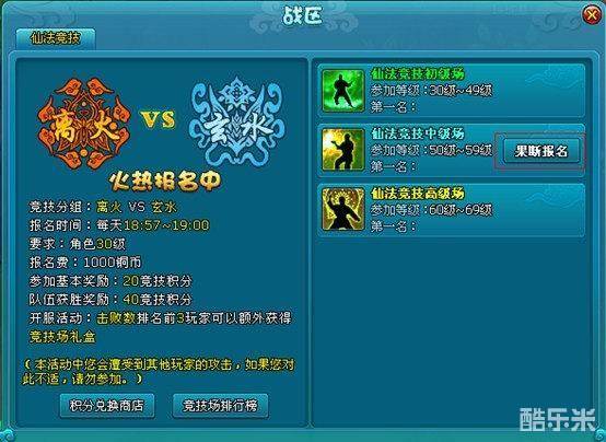 1.所有30级以上的玩家在每天的18:57~19:00可报名参加竞技场战斗。