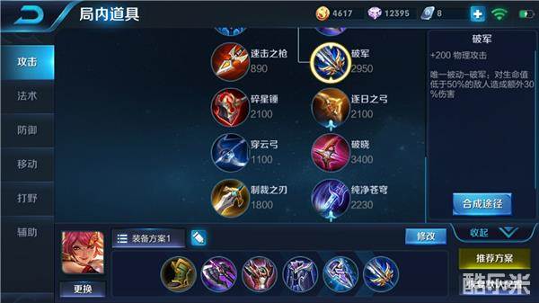 影刃之足+暗影战斧+反伤刺甲+魔女斗篷+冰痕之握+破军