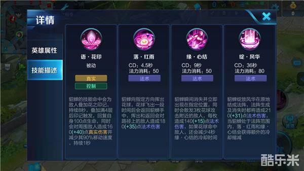 貂蝉的技能命中敌人之后会给敌人叠加印记,印记会存在一段时间,叠加满一定层数之后印记会触发爆炸,为貂蝉回复一定生命值同时对周围敌人造成真实伤害并在短时间内减少敌人的移动速度。该技能是貂蝉非常重要的一个技能,保证了前期的续航能力,她可以利用一二技能的搭配使用快速叠满印记触发被动,打出可观的伤害。