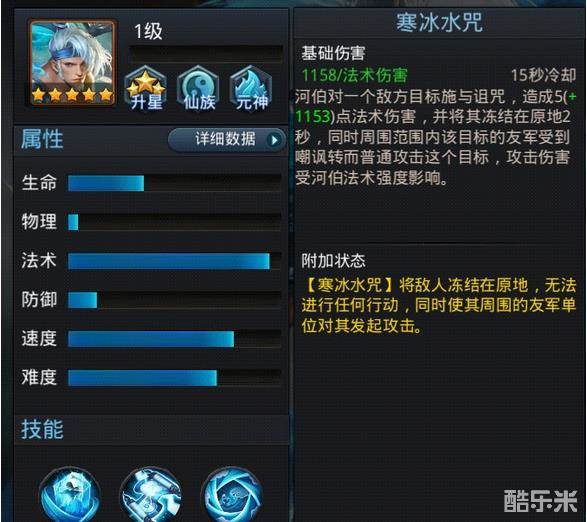 1、寒冰水咒:河伯对敌方一个目标实施诅咒,造成法术伤害,并将其冻在原地两秒,同时该目标周围范围的友军受到嘲讽普通攻击该目标,伤害视河伯的法术强度而定。