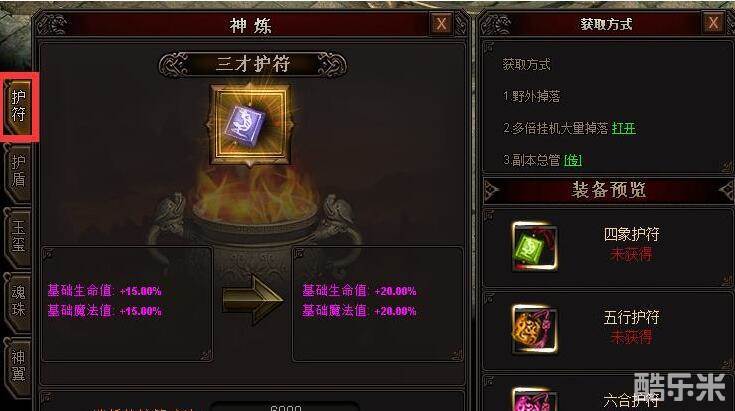 护符分为10个等级,等级越高的玉佩能够提供给角色更高的生命值加成和魔法值加成,让你在打BOSS、玩家PK当中不在为血少蓝少而烦恼。