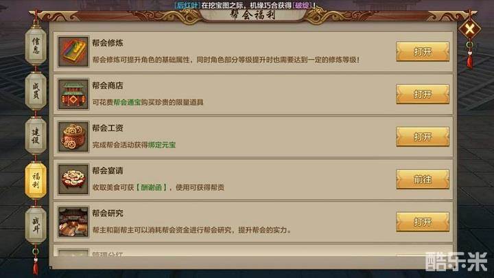 帮会商店的物品并不会一成不变,而是随着帮会建设的提升而逐渐增加商店等级的。帮会商店共分为5级,等级越高的帮会商店出售的物品质量也就越好,同时等级较高的帮会商店还会出现一些即使用元宝也买不到的材料哦!而一级的帮会商店也只能购买一些地煞精华、比较容易获得的任务道具而已。